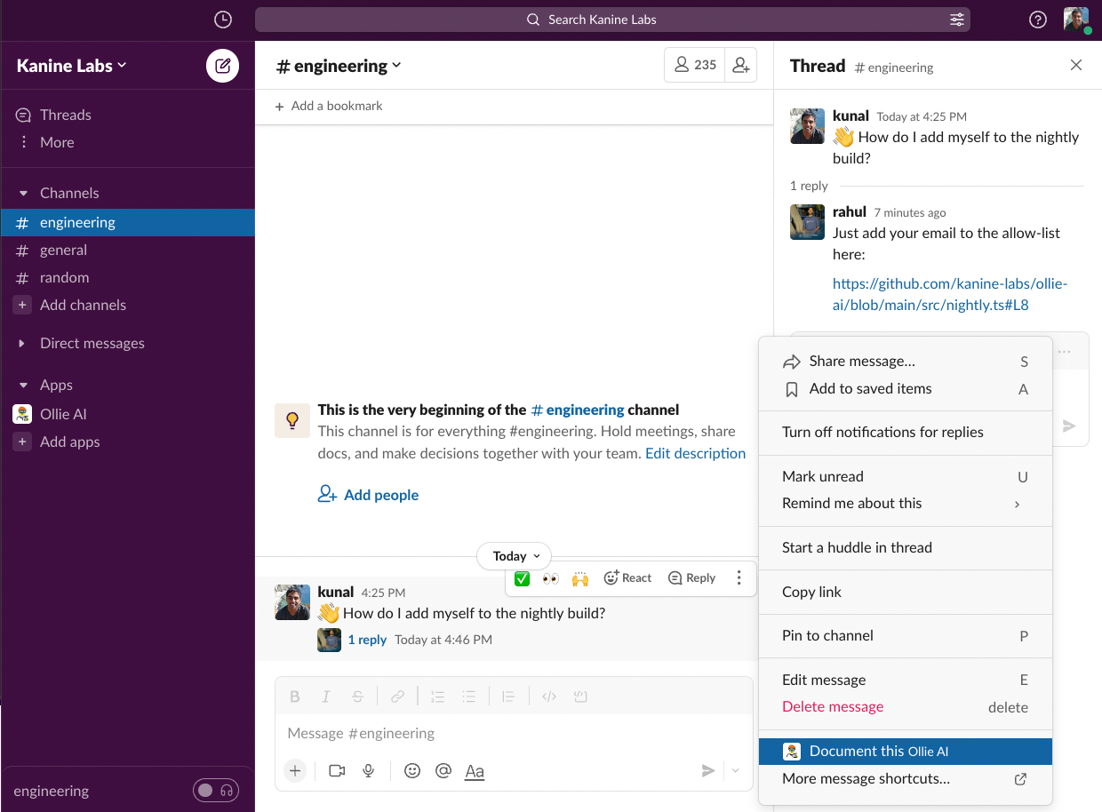 Developers lose 5 - 10 hours/week answering and asking engineering questions. Yet, the context from these conversations gets documented less than 5% of the time. 65% of the time it's stuck in Slack private channels or DMs, hidden from the rest of the engineering team. Ollie AI makes it trivial to capture that information and share it with the rest of your team so everyone can benefit. Just right-click a Slack thread (channels or DMs) or screenshot any context and Ollie AI will surface the information when called upon!