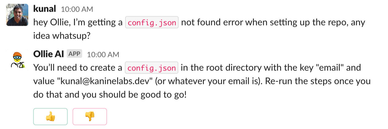 Ollie can help answer all of your questions all within Slack. Just DM or @mention Ollie, and Ollie will do its best to help you get unblocked.